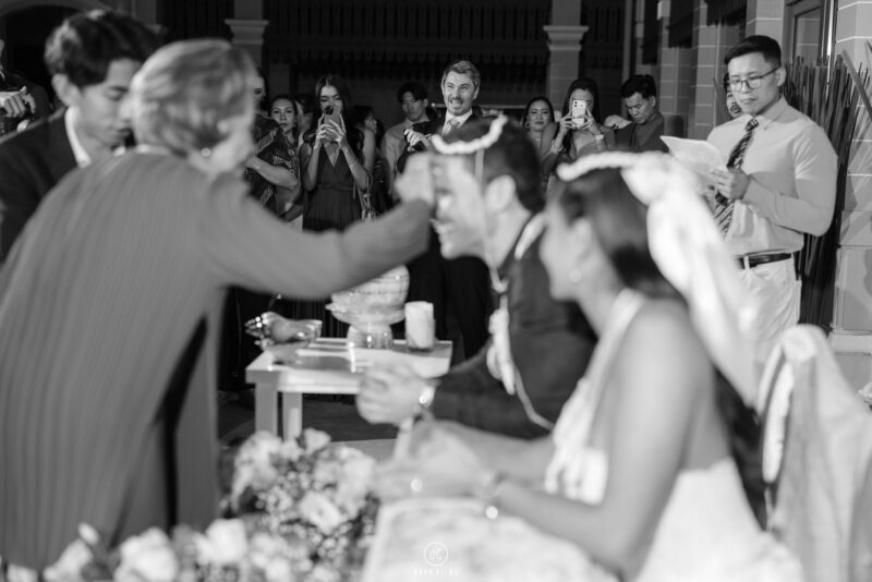 A Thai wedding combines meaningful traditions such as the water blessing ceremony, monk blessings, and symbolic rituals that represent love, respect, and unity.
