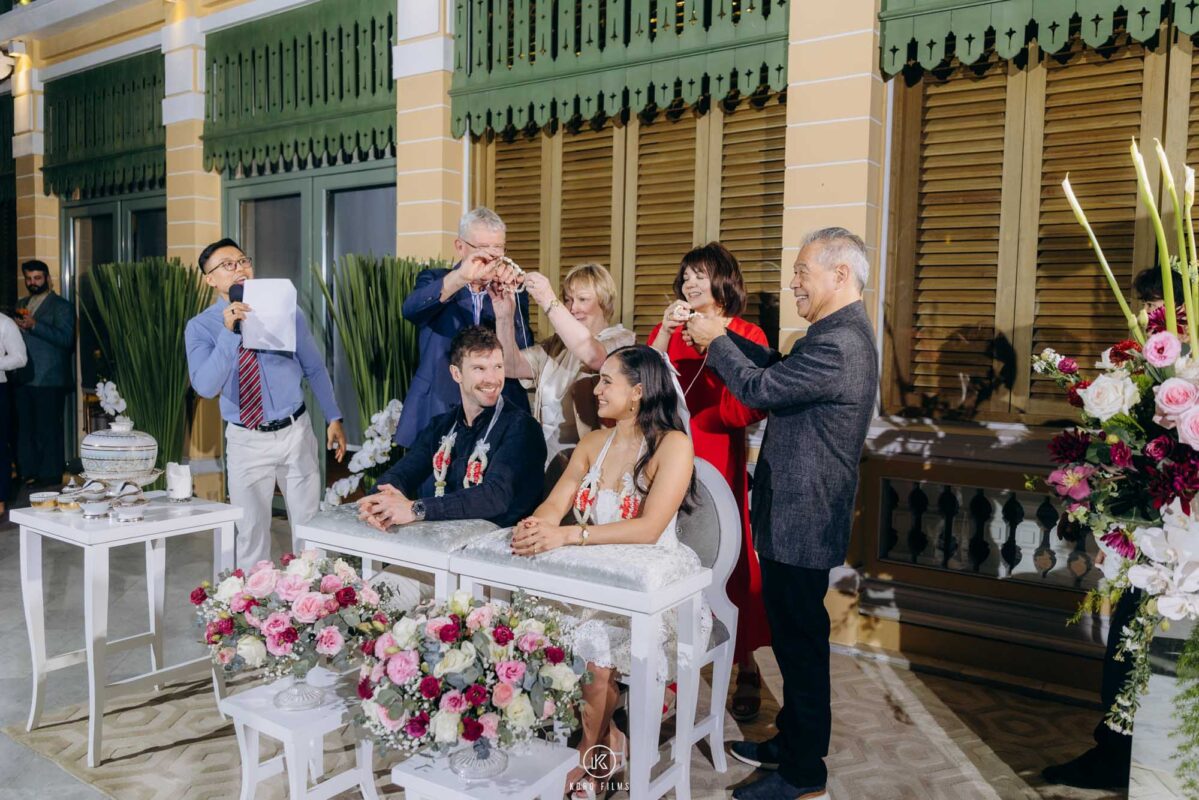A Thai wedding combines meaningful traditions such as the water blessing ceremony, monk blessings, and symbolic rituals that represent love, respect, and unity.