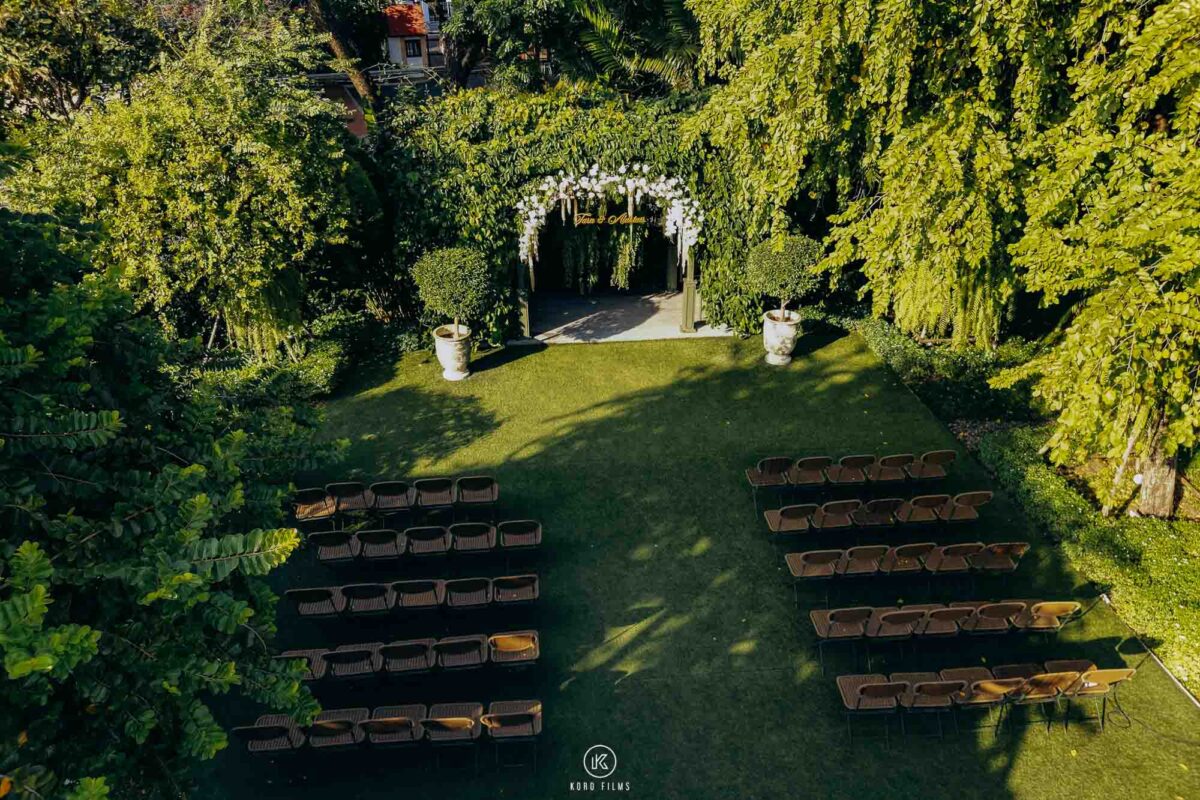 Drone footage adds a beautiful perspective of the garden layout and ceremony setup. It is especially impactful for highlight wedding films.